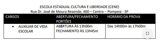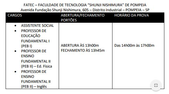 Candidatos devem comparecer ao local indicado com no mínimo uma hora de antecedência, munidos de comprovante de inscrição, documento oficial de identidade, caneta esferográfica preta ou azul, com