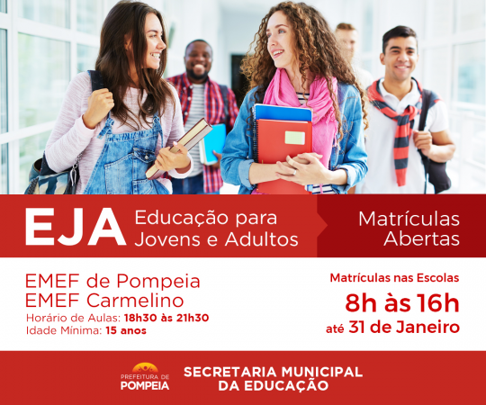 Estão abertas as matrículas para a educação de jovens e adultos nas EMEFs "Grupão" e "Carmelino". Os interessados podem procurar as escolas das 8h às 16h, até o dia 31 de janeiro. As aulas ocorrerão no período noturno, das 18h30 às 21h30. A idade mínima para participar é de 15 anos. Mais informações na secretaria da Educação, localizada na rua Moysés Ferreira Martins, n. 18, bairro Flandria, ou pelo telefone 3452-2818.