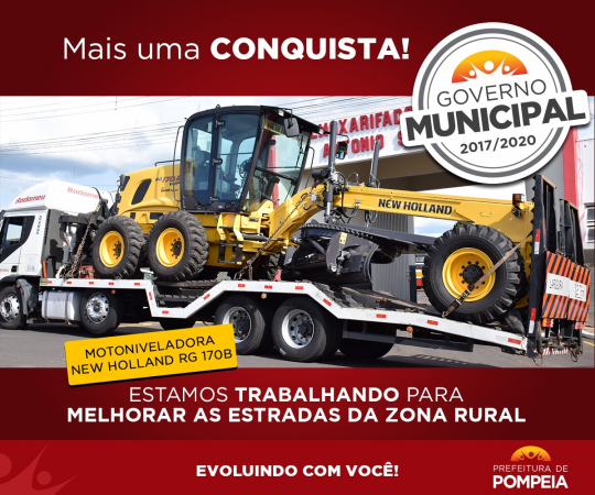 “Estamos trabalhando! Mais uma conquista! Nova máquina motoniveladora New Holand RG 170B para Pompeia. É a conquista que os produtores e moradores da zona rural esperavam. Um investimento alto! Importante para a manutenção de estradas. Fundamental para o desenvolvimento da cidade!”, comentou Tina.