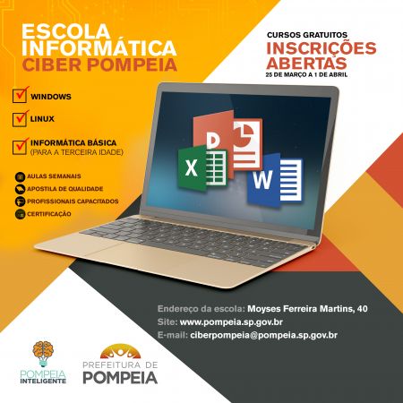 A administração Tina Januário, por meio das suas Secretarias de Tecnologia da Informação e da Educação, abriu inscrições para os cursos gratuitos de Windows, Linux e Informática Básica (para terceira idade) que serão oferecidos na nova Escola Municipal de Informática de Pompeia, localizada na rua Moyses Ferreira Martins, 40. Inicialmente, há 50 vagas por curso, com aulas semanais. Interessados podem se inscrever entre 9h e 12h, até o dia 1º de abril, na Secretaria Municipal da Educação.