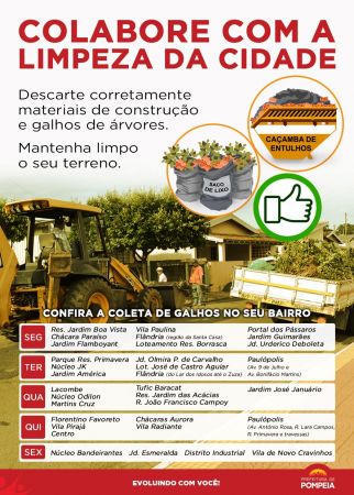 Um novo trator cortador de grama adquirido pela Prefeitura de Pompeia já proporciona mais agilidade ao trabalho de manutenção de parques, praças e campos de futebol. O equipamento é compacto, fácil de manobrar, versátil e rápido. O setor de serviços urbanos também conta com novos caminhões para a coleta diária de lixo domiciliar e para a coleta de galhos, que tem um calendário semanal. Nesta terça (18) a coleta de galhos foi realizada nos bairros Primavera, JK, Jd. América, Jd. Olmira, Flândria, Loteamento José de Castro Aguiar e em Paulópolis. Confira abaixo o calendário completo.