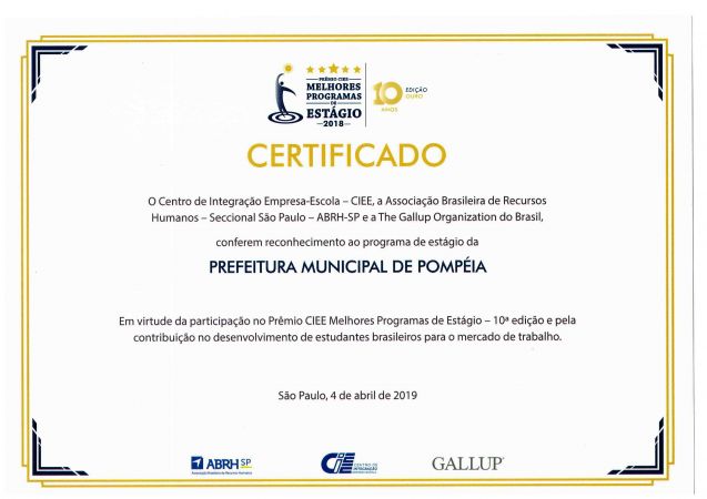 O trabalho da Prefeitura de Pompeia para gerar empregos e incentivar a inserção dos jovens no mercado de trabalho foi reconhecido pelo Prêmio CIEE Melhores Programas de Estágio. A décima edição da premiação, realizada pelo Centro de Integração Empresa Escola, avaliou empresas e órgãos que incentivam o desenvolvimento de estudantes por meio do estágio, preparando cada jovem para o mercado de trabalho.