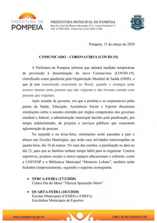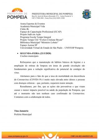 Ressaltamos, por fim, que as ações são preventivas e que visam causar o menor impacto possível na saúde da população de Pompeia, que até o momento não tem nenhum caso confirmado de Coronavirus. Contamos com a colaboração de todos.