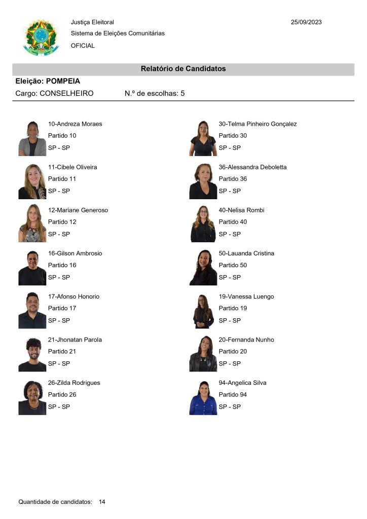 São 14 candidatos aptos para a votação, sendo que o eleitor pode escolher até cinco nomes para votar. O munícipe que deseja votar deve comparecer até a EMEF de Pompeia munido de documento de identificação com foto e o título de eleitor.