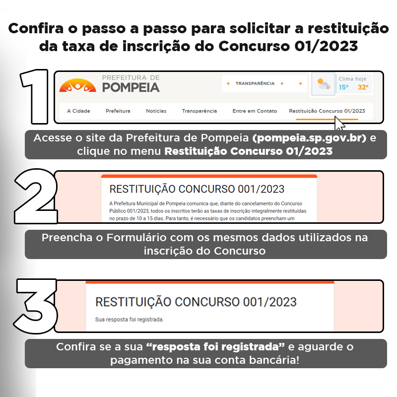 Para evitar quaisquer prejuízos aos candidatos afetados, a Prefeitura se comprometeu a restituir integralmente as taxas de inscrição pagas no prazo de 10 a 15 dias. A restituição será efetuada mediante o preenchimento de um formulário eletrônico disponível no site oficial da Prefeitura de Pompeia.